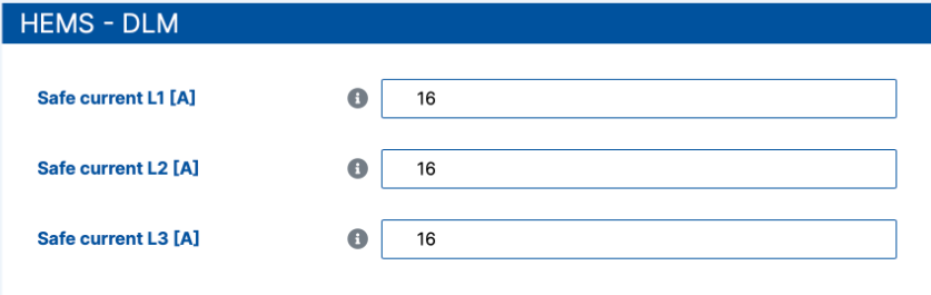 - The factory settings of the Wallbox set under the point 'Load Management' in the section 'Hems-DLM'